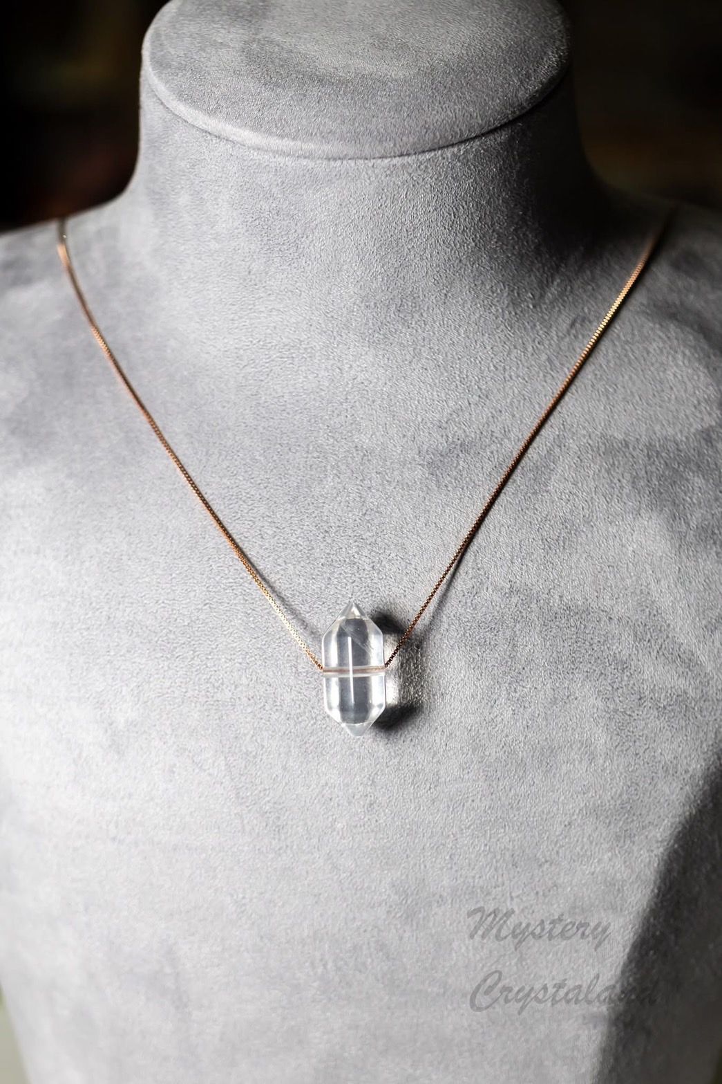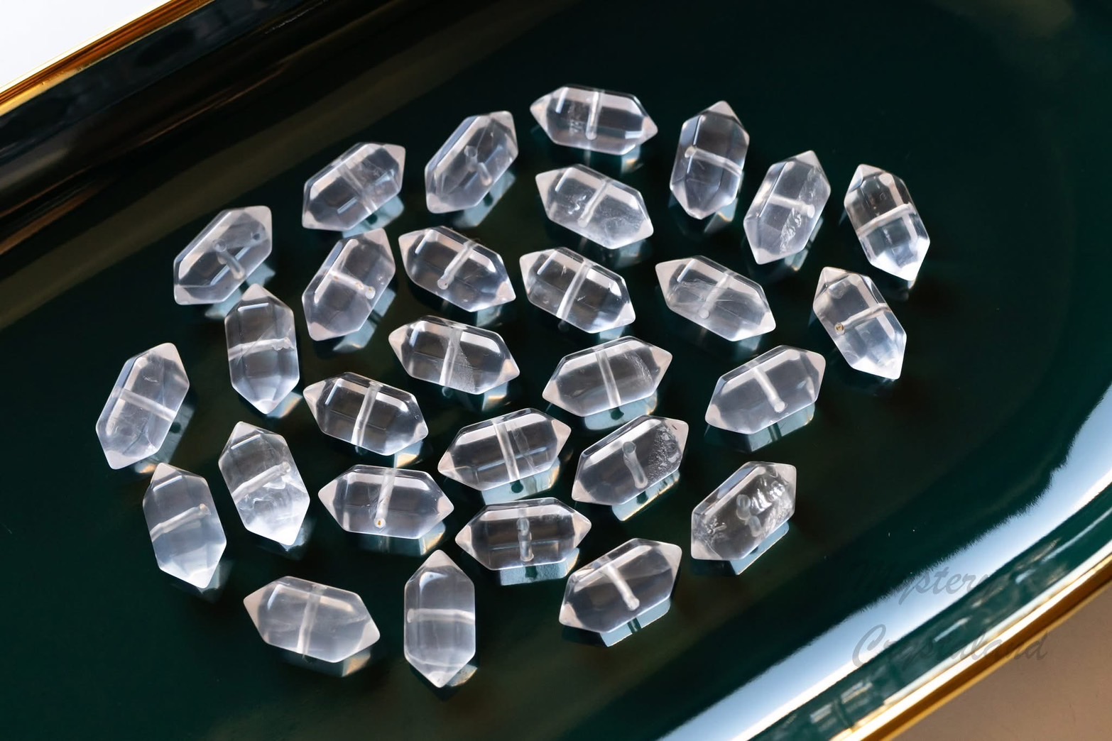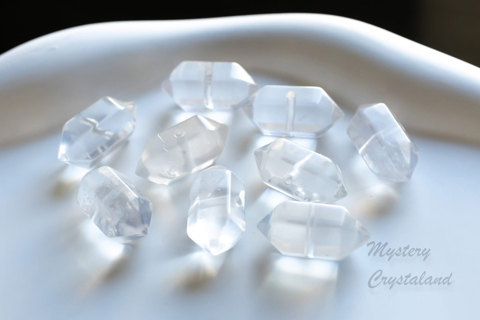 這款雙尖白水晶,是經過切割打磨,呈現出對稱的六角雙尖造型。像是一顆顆凝聚的小冰柱,保留了這批白水晶最單純的透亮與能量。